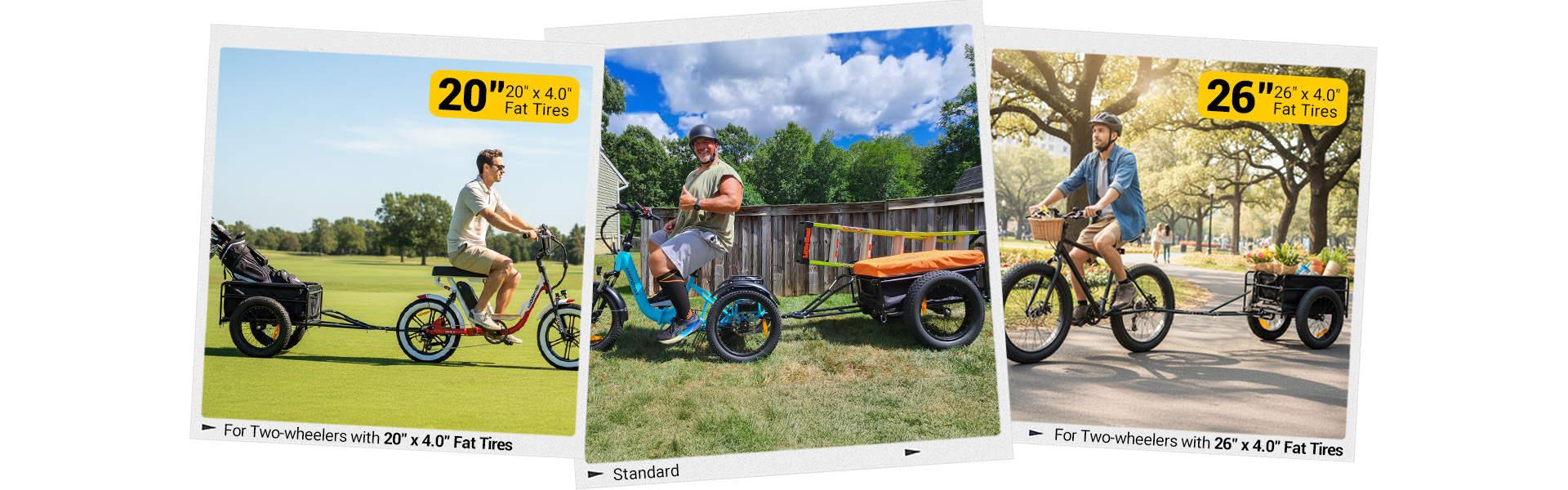 Addmotor offers multiple configurations: the Standard option for trikes (20" × 4.0" fat tires), plus options bundled with tow bars for two‑wheel ebikes with 20" or 26" fat tires. Select the correct tow bar option for your vehicle’s wheel size to preserve centerline alignment and handling.